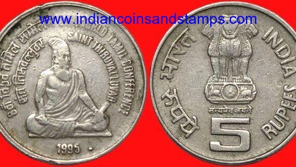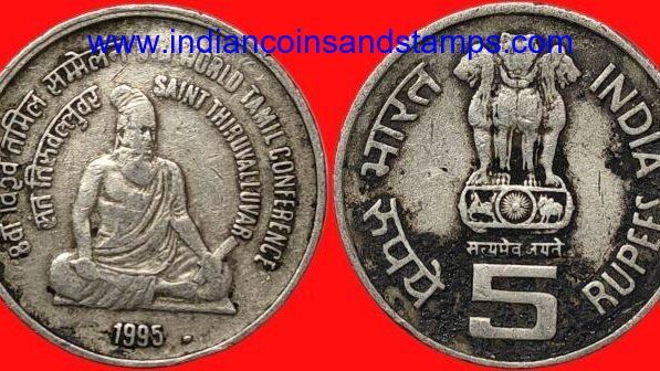 5 Rupees 1995 8th World Tamil Conference Saint Thiruvalluvar Noida Copper Nickel