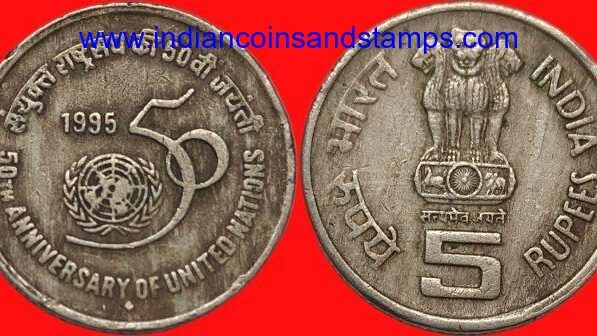 5 Rupees 1995 50th Anniversary Of United Nations Mumbai Copper Nickel