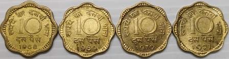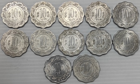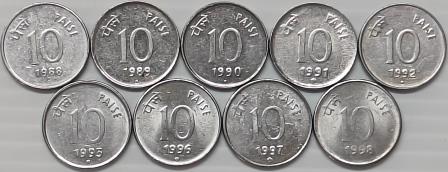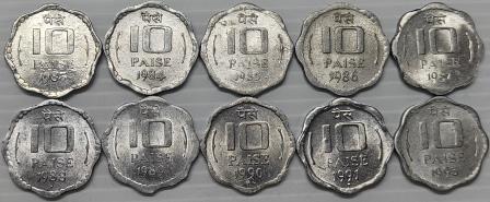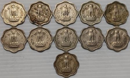 10 Paise 1957 to 1967 Complete Year Wise Set of 11 Coins Copper Nickel