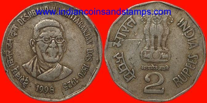 2 Rupees 1998 Deshbandhu Chittaranjan Das Kolkata Die Crack Error Copper Nickel