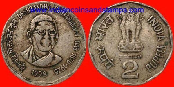 2 Rupees 1998 Deshbandhu Chittaranjan Das Kolkata MAD Error Copper Nickel