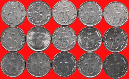 25 Paise 1988 to 2002 Year wise Complete Set 15 Coins Steel