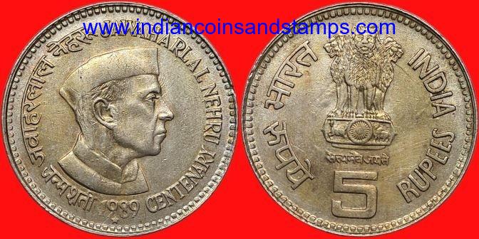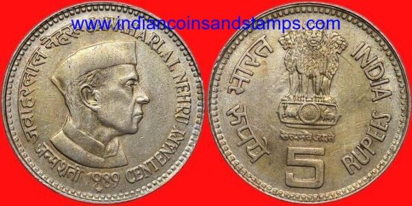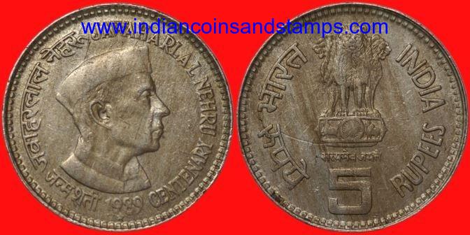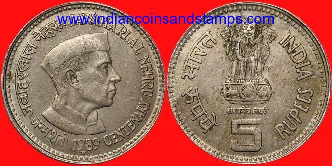 5 Rupees 1989 Jawaharlal Nehru Centenary Hyderabad Copper Nickel
