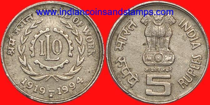 5 Rupees 1994 ILO World Of Work Hyderabad Copper Nickel