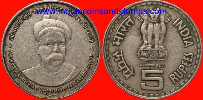5 Rupees 2007 150th Birth Anniversary Of Lokmanya Balgangadhar Tilak Mumbai Copper Nickel
