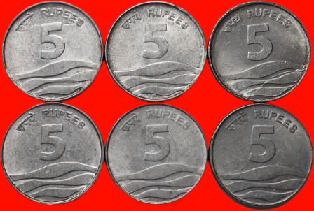 5 Rupees 2007 to 2008 Complete Mint Wise Set of 6 Coins Steel
