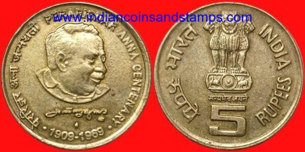 5 Rupees 2009 Perarignar Anna Centenary Mumbai