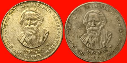 5 Rupees 2011 150th Birth Anniversary Rabindranath Tagore Hyderabad Lion Variety Nickel Brass