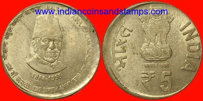 5 Rupees 2013 125 Anniversary of Maulana Abul Kalam Azad Kolkata Shift Error Nickel Brass
